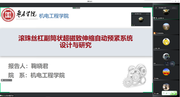 鞠晓君博士做了题为“滚珠丝杠副筒状超磁致伸缩自动预紧系统设计与研究”的学术报告。报告首先介绍了滚珠丝杠副和自动预紧系统的研究背景和现状,然后对滚珠丝杠副筒状超磁致伸缩自动预紧系统的结构进行设计和优化,并进行CGMA多场景仿真和输出特性研究,其次,对该系统的建模和控制进行了阐述,最后介绍了其主要应用和性能。