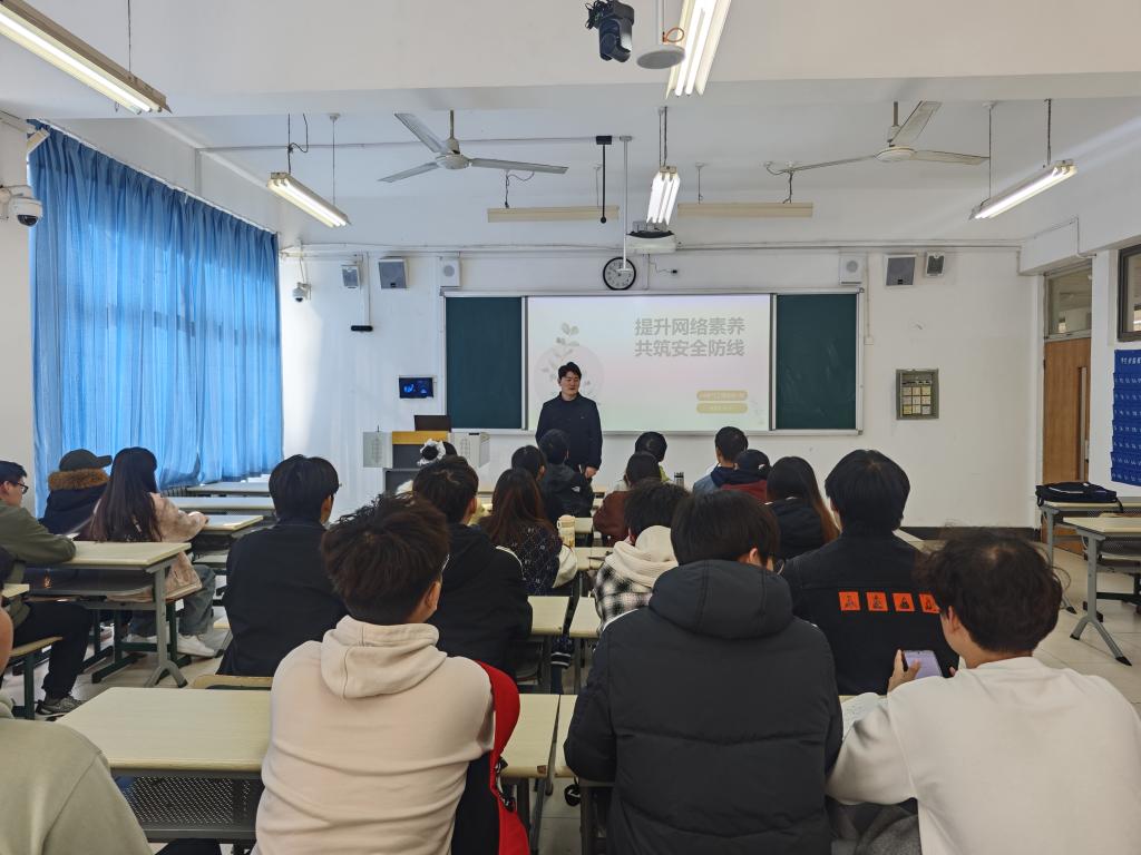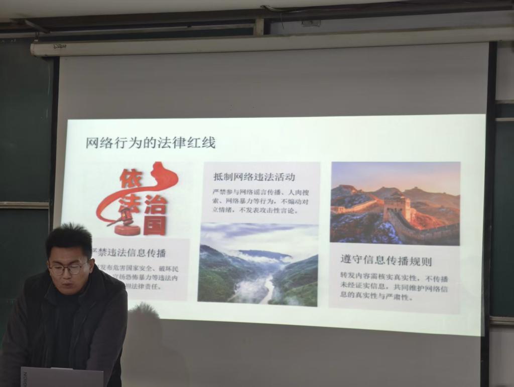 班会上,辅导员结合典型案例深入解读法律法规红线,强调网络并非法外之地,要严守法律底线,恪守公序良俗。针对学生群体在社交平台的创作与传播行为,辅导员指出,学生在网络平台发布的内容,严禁传播虚假信息、恶意攻击他人、泄露个人或校园涉密信息,严禁发布违背公序良俗、损害集体荣誉的言论或内容。提醒学生要维护群体公信力,全面体现当代大学生积极向上的精神风貌,遇可疑情况及时向学校保卫处或公安机关求助,增强学生应急处理能力。