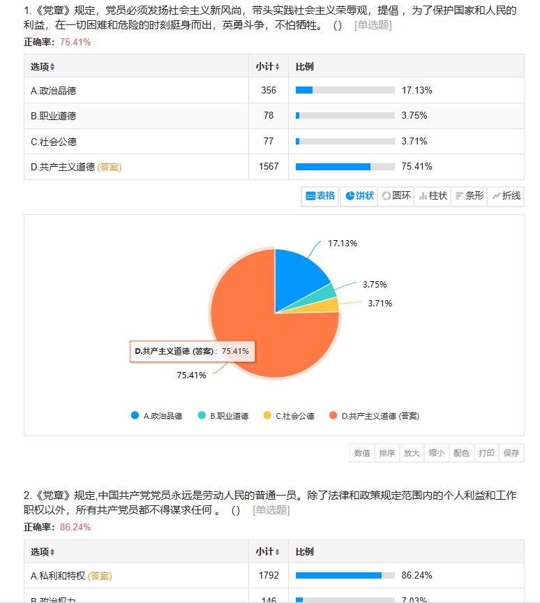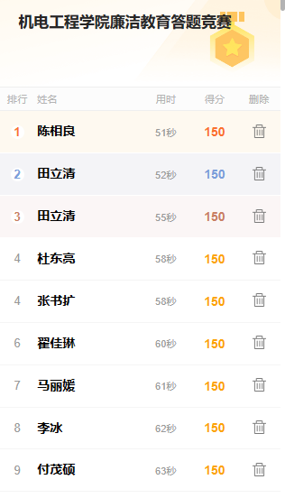 此次比赛依托在线问卷调查平台,内容涵盖了党政廉洁、从严治党、廉洁文化和廉洁自律等知识,包含单选题、多项选择题和判断题多种题型,也全面考察了学生对于廉洁文化建设的内涵和理解。10月30日晚,线上廉洁知识竞赛活动落下帷幕。据统计,共提交1738份答卷,依据答题分数和用时排名。其中,获得满分150分的有453名同学,获得140分以上的有757名同学,获得130分以上的有885名同学,整体表现较好。